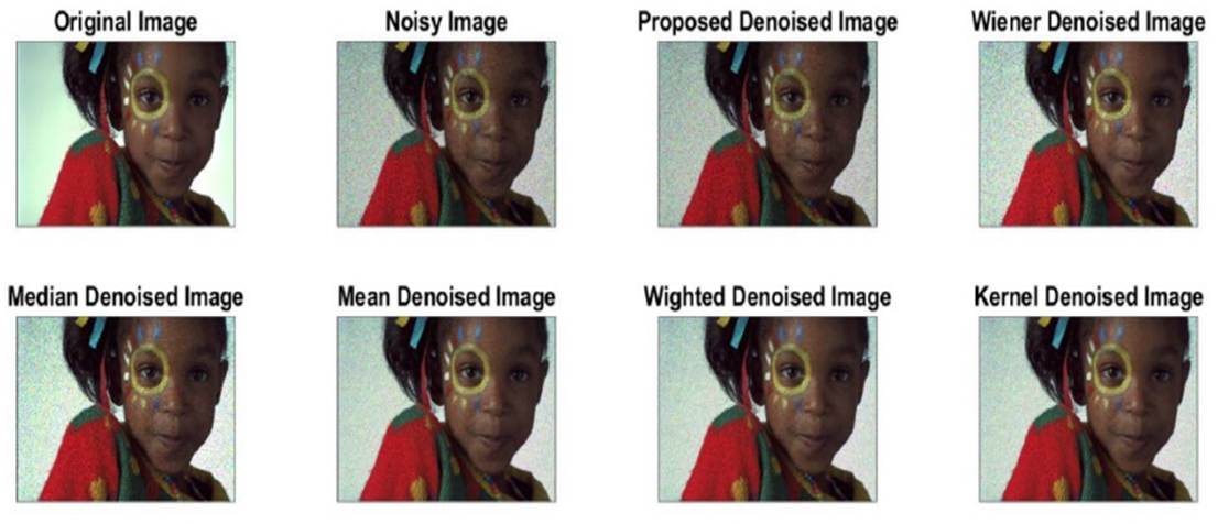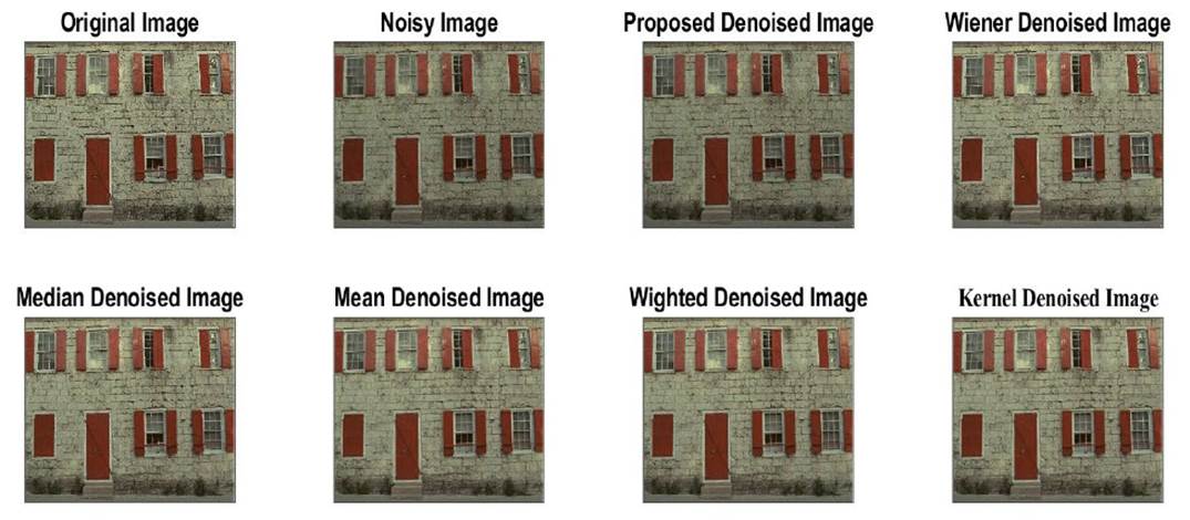 Table 1 shows the results of a study that compared various noise-reducing filters on images with varied levels of noise. With several metrics used to measure the filters' efficacy delineated in the columns, every row indicates a separate test instance. In particular, the metrics include the PSNR (peak signal-to-noise ratio) of the restored and source images. Notable findings include the suggested filter's persistently higher PSNR values compared to conventional filters such as Wiener, median, mean, weighted, and Kernel filters, which hold true across a wide range of noise intensities. The suggested filter shows remarkable resilience and the ability to effectively reduce noise without sacrificing image quality, as it continues to function exceptionally well even when faced with extremely high noise density. In contrast, the comparable filters' results vary depending on the level of noise, some of them showing reduced efficacy at greater densities. These results show that the suggested filter mechanism works, especially in difficult noise reduction situations, therefore it could be an effective way to tackle image denoising problems.