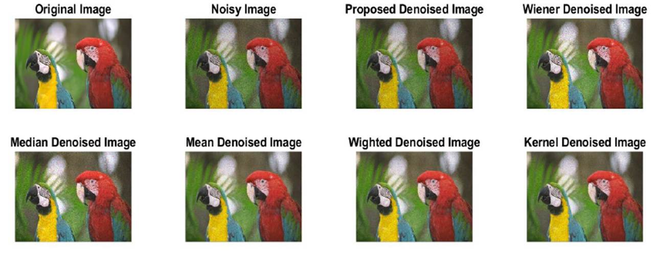 Through the denoising process, for each color channel, the filter is optimized through the meticulous fine-tuning of PSNR-based goal functions. Speckled noise, a persistent issue in the field of image processing, is specifically targeted for resolution. The BOA, inspired by echolocation, uses a special behavior to help the AEWF better tell apart the important parts of an image from the background noise. The AEWF can effectively reduce noise caused by speckles by changing its settings based on the specific features of the image.
