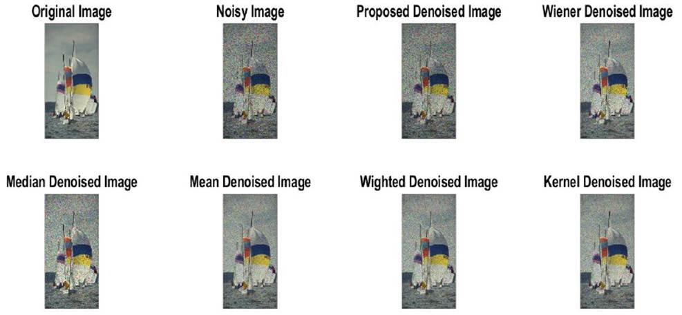 Case 2: For real-world evaluation, we utilized the KODAK dataset (Kodak dataset, n.d.), consisting of 24 images in PNG format, with sample images shown in Figure 3. The dataset is also an immensely popular validation dataset in the field of data compression. All images have dimensions of either 768x512 pixels or 512x768 pixels, depending on the orientation. Various levels of scatter noise were introduced, with variances of 0.01 in Figure 4, 0.05 in Figure 5, 0.1 in Figure 6, and 0.2 in Figure 7. These noises were subsequently removed using both conventional and proposed denoising techniques. PSNR and SSIM were computed for each method across different noise variances to assess their efficacy. Additionally, visual samples of the results were presented for comparative analysis. MATLAB 2022a software was employed for result acquisition, utilizing a computer system equipped with an Intel Xeon Silver 2.6 GHz processor, 16 GB RAM, and an NVIDIA GTX960M Quadro CPU.