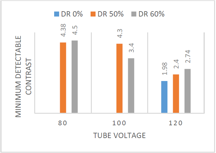 The lowest low contrast detectability value was produced by setting a tube voltage of 120 kV, 220 mAs and 0% dose reduction, namely 1.98, while the highest was produced by setting a tube voltage of 80 kV and 50% dose reduction, namely 4.5. The low contrast detectability average of the treatment group was 3.62.