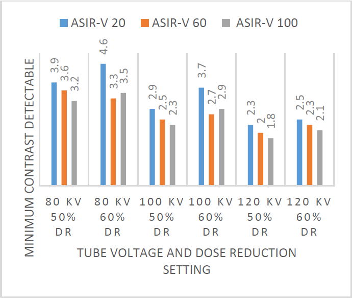 VCT phantom images that have been evaluated for image quality are then reconstructed with ASIR-V values of 20%, 60%, 100%. In the different tests performed, the MCD image of each combination of tube voltage and dose reduction variations before and after ASIR-V reconstruction (20%, 60% and 100%) showed that there was a decrease in the minimum contrast detectability value in each group. so that the higher the ASIR-V value, the lower the resulting minimum contrast detectability value.