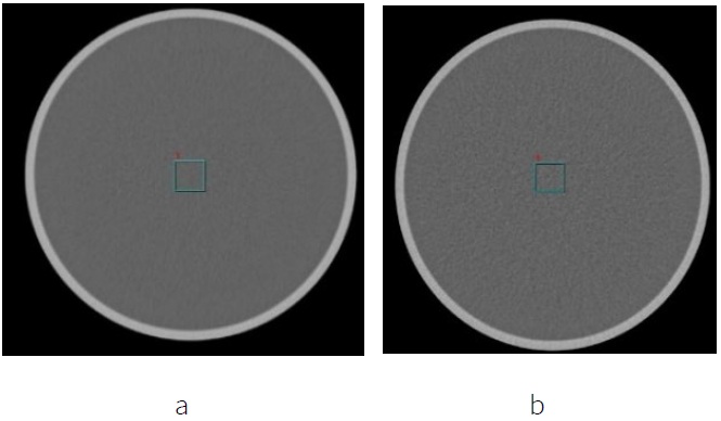 The noise evaluation is generated by placing the ROI in the middle of the object which is the image of the VCT phantom water section. Figure 3 shows the ROI placement used to generate image noise values with the resulting noise values presented in Figure 4 below.