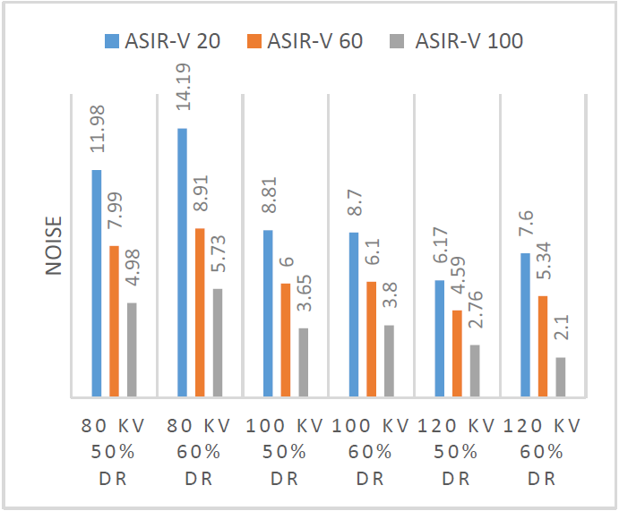 Based on the graph, the noise reduction in each group, the higher the ASIR-V value, the lower the noise value. paired t-test shows that there is a significant difference in the value of image noise in each combination of tube voltage and dose reduction variations before and after ASIR-V reconstruction (20%, 60% and 100%) there is a difference in noise with variations in tube voltage settings, dose reduction and ASIR-V reconstruction on CT scan. After conducting a different test with the paired t-test, the results obtained from 15 variations were significantly different from the control group. Noise values that do not have a significant difference are using 80 kV DR 60% ASIR-V 100%, 100 kV DR 50% ASIR-V 60% and 120 kV DR 60% ASIR-V 60%.