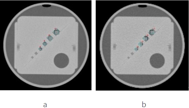 Figure 9 Low contrast detectability measured a) 80 kV, 220 mAs and 0% dose reduction (standard acquisition), and b) 80 kV and 60% dose reduction setting.