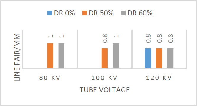 The graph in Figure 7 shows that the smallest bar pattern size that appears is 0.8 mm obtained from standard acquisition images (120 kV tube voltage and 0% dose reduction), images with a combination of 120 kV tube voltage settings and 50% & 60% dose reduction, as well as tube voltage settings of 100 kV and 50% dose reduction. The largest visible bar pattern size of 1 mm was obtained from images with a tube voltage setting of 100 kV and a dose reduction of 60%, and a tube voltage setting of 80 kV with a dose reduction of 50% and 60%.