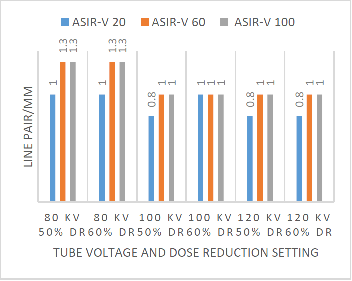 The results showed that a decrease in the tube voltage setting accompanied by an increase in the dose reduction setting can cause a decrease in the quality of extreme contrast resolution, which is indicated by the inability to clearly show the bar pattern with a smaller size. Meanwhile, in the different tests performed, the HCR of the image for each combination of tube voltage and dose reduction variations before and after the ASIR-V reconstruction showed that there was a decrease in the extreme contrast spatial resolution of the images in several groups. The combination variations that show a visual difference in HCR between before and after the application of ASIR-V are 80 kV, dose reduction 50% & ASIR-V 60%; 80 kV, dose reduction 50% & ASIR-V 100%; 80 kV, dose reduction 60% & ASIR-V 60%; and 80 kV, dose reduction 60% & ASIR-V 100% which experienced a decrease in HCR was marked by an evaluation of the bar pattern that appeared after the ASIR-V reconstruction was applied, namely a bar pattern measuring 1.3 mm, whereas previously a bar pattern with a size of 1mm; while the 100 kV group, 100 kV, dose reduction 50% & ASIR-V 20%; 100 kV, dose reduction 50% & ASIR-V 60%; 100 kV, dose reduction 50% & ASIR-V 100%; 100 kV, dose reduction 60% & ASIR-V 20%; 100 kV, dose reduction 60% & ASIR-V 60%; 100 kV, dose reduction 60% & ASIR-V 100%; 120 kV, dose reduction 50% & ASIR-V 20%; 120 kV, dose reduction 50% & ASIR-V 60%; 120 kV, dose reduction 50% & ASIR-V 100%; 120 kV, dose reduction 60% & ASIR-V 60%; 120 kV, dose reduction 60% & ASIR-V 100% experienced a decrease in HCR marked by an evaluation of the bar pattern that appeared after the ASIR-V reconstruction, namely you can see a bar pattern measuring 1 mm, whereas previously a bar pattern with a size of 0.8 mm was visible.