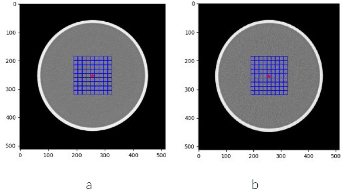 Evaluation of low contrast detectability is generated by placing a grid-shaped ROI in a homogeneous area to obtain the minimum detectable contrast (MDC) value. Figures 9 show the placement of the ROI used to produce low contrast detectability images with the results of the minimum detectable contrast values presented in Figure 10 below.