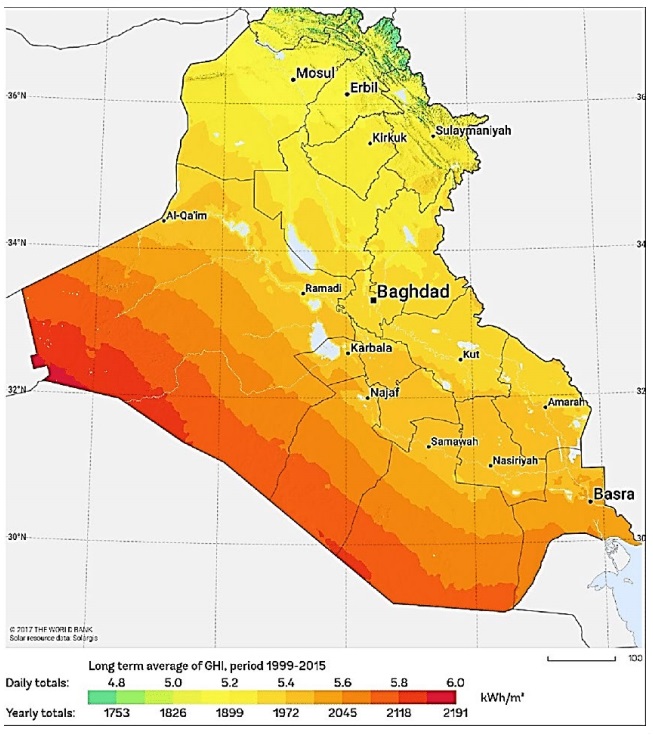 Iraq has an attractive geographical location and great weather conditions for solar energy harnessing. Its dry and rainless wide areas together with an intensive and long-lasting solar radiation make it an appropriate place for solar energy investments. The map of global horizontal irradiation of Iraqi regions is illustrated in Figure 1. The location of the present study, the Babel city located 50 miles south of Baghdad, has a high average global solar radiation reached up to 5.16 kWh/m2/day, with more than 3000 yearly shinning hours (Muslim, 2019).