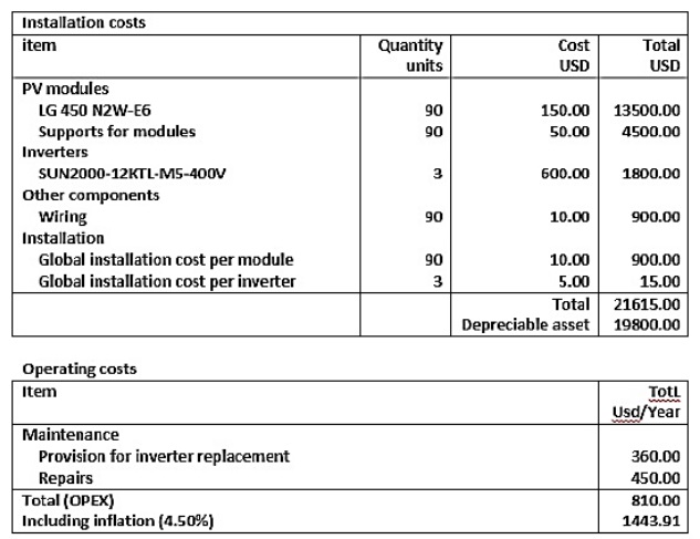 The high capital cost is considered the most crucial drawbacks of PV system installation. Even in the on-grid system, where the storage batteries are not needed, the initial cost is still considerable. Nevertheless, the running cost for such systems is exceptionally low during the entire lifetime of the project. PVsyst program helps in conducting a detailed economic evaluation of the project, but a basic study is enough to display the viability of PV system installation. Figure 10 represents the estimated prices of the different system components and accessories in addition to the estimated costs of supports and installation. The prices have been determined based on the common values in the known local market. An extra 2% of the total project cost is added as an estimation of the yearly maintenance cost, with an inflation rate set at 4.5%.