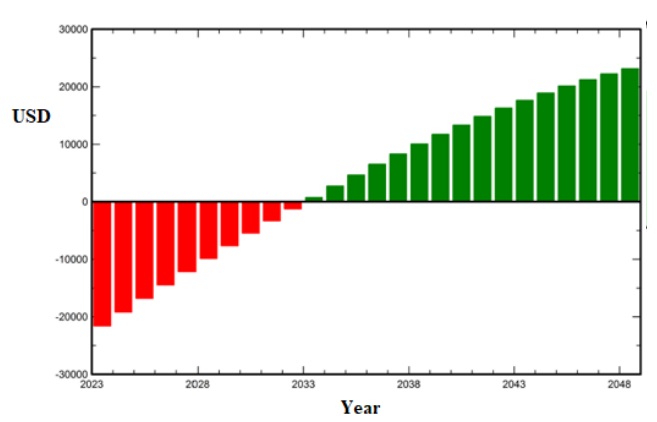 Based on the total cost and the total net produced energy, the levelized cost of electricity (LCOE) is calculated to be 0.055 USD/kWh. Considering a fixed feed-in tariff at 0.046 USD/kWh, and a project lifetime at 25 years, the investment cost can be recovered within 9 years, and the net profit from the project exceeds 20,000 USD. Figure 11 shows the cumulative cashflow of the project.