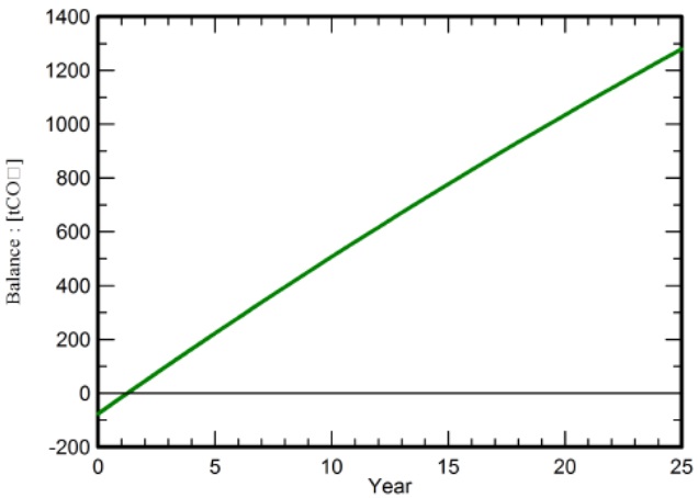 No doubt that PV systems emit harmful gasses, such as carbon, nitrogen, and sulphur oxides, much less compared to fossil fuels systems. The solar energy lifetime emissions are estimated to be less than 40 gCO2/kWh, according to the National Renewable Energy Laboratory (NREL). PVsyst program estimates the CO2 emission savings by comparing the carbon emissions resulted from the PV system and that resulted from a traditional system of a similar capacity. According to the International Energy Agency (IEA), the carbon emissions from Iraqi grid are estimated to be 869 gCO2/kWh for the project lifetime. The calculations show that the total emission of the PV system and its components is 76.3 tCO2 for the project lifecycle. On the other hand, the carbon emission of a fossil fuel system with similar produced energy for the same time is reached 1525.7 tCO2. Figure 12 illustrates the carbon emission balance for the project lifetime, 25 years. It can be noticed that a huge saving in CO2 emission at 1279.6 tCO2 is attained because of PV installation. This finding confirms, for sure, the already known positive environmental impact of the solar energy.