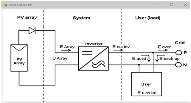 The present project is about designing a rooftop on-grid PV system for the purpose of supplying the full or partial required load for the Hillah High School located in Babel city, Iraq. Figure 2 represents a simplified diagram of such system and its components, PV array, inverter, and an electric load. The required load is determined based on the expected loads of the essential equipment in the building. The analysis includes determining the PV panels’ capacity and/or determining the required area, selecting, and determining the capacities of the other system components, determining the energy output and the performance ratios, determining the system losses, and finally evaluate the economic costs and environmental effects during the project lifetime.