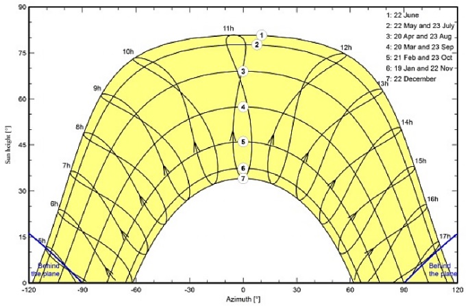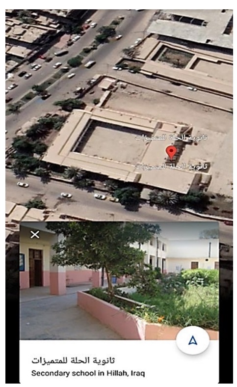 Figure 4 shows the geographical location of the present study, the Hillah High School for specials girls in the Babel city, Iraq. This school is located at latitude (N) 32.4920, longitude (E) 44.4382, and elevation 37 m. The location is firstly defined by introducing the geographical coordinates to the PVsyst program, and then the weather data, particularly the solar radiation and the outdoor temperature are obtained. The sun paths during the year months can also be obtained.