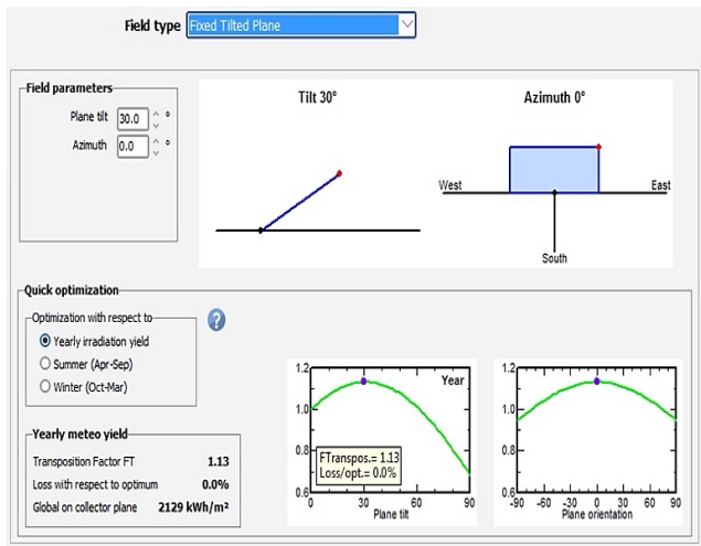 The solar panels must be directed in a way that they can receive the most possible incident radiation over the year, and they can minimize the power losses to the lowest level. Figure 6 demonstrates the panel orientation settings in the present study. The azimuth angle is set to 0o (corresponding to the south direction), and tilt angle is set to 30o, so that the orientation losses are totally avoided.