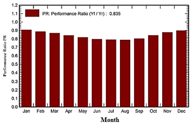 The performance ratio expresses the ratio between the actual PV system obtained output energy to the theoretical predicted energy. Figure 7 demonstrates the values of the performance ratio of the proposed system during all year months. There are slight variations in PR monthly values, with larger values recorded in winter months. This can be attributed to the negative effect of the high ambient temperature on the losses from PV panels. The yearly average value of the performance ratio of the considered PV system is 0.835, which is a high value.