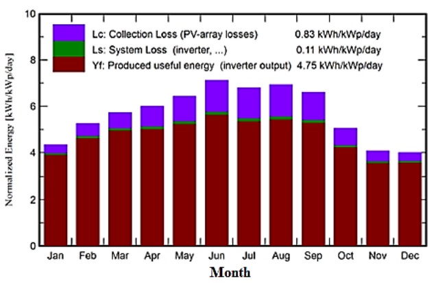Figure 8 illustrates the normalized produced useful energy together with the PV arrays and system losses. The energy production is higher in summer months due to high solar radiation rates and due to long sun-shining hours in these months. The maximum produced useful energy has reached up to 5.9 Wh/kWp/day. However, at the same time, the rates of energy losses have been noticed to be higher in these months due to the negative impact of the increase in ambient temperatures on PV system performance, as has been mentioned before.