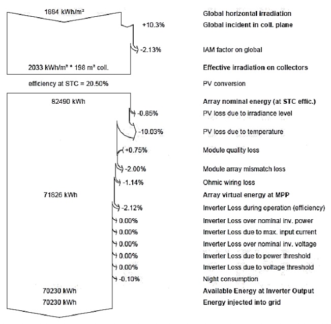 Figure 9 provides detailed data related to the power losses of the PV system, in a form of an arrow diagram. It includes the different losses resources of the complete PV system, starting from the input solar radiation and ending with the output net power. The nominal energy of the PV arrays is 82.49 MWh, whereas the available energy injected into grid is 70.23 MWh. This means that 15% of the possible produced energy is lost due to several causes, including PV cells losses and electrical inverter losses. The PV losses due to temperature itself form more than 10% of the total losses. The proper design of the PV system and its components helps in reducing these losses to the lowest possible level.