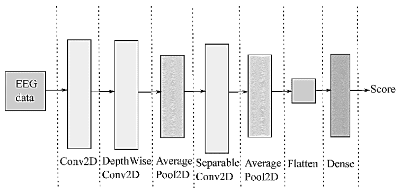Deep Learning-based EEGnet framework: For supporting EEG analysis with deep learners, the compact EEGNet convolutional network provides convolutional kernel connectivity between acquired neural responses and extracted feature maps, enabling its use in different MI paradigms. Figure 2 shows that the EEGNet pipeline initiates with a temporal convolution to learn frequency filters, followed by a depth-wise convolution connected to each feature map. As a result, frequency-specific spatial filters can be learned. Further, the separable convolution combines a depth-wise convolution, which infers a temporal summary for each feature map individually, followed by a point-wise convolution, which identifies how to mix the feature maps optimally for class-membership prediction.
