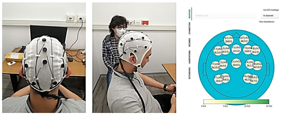 The above-described impedance calibration is automated over the entire EEG montage using the interface displayed in Figure 3, coloring in green those electrodes with impedance values within the proper range. In contrast, the wrong electrodes are colored in red. In the latter case, the cap should be adjusted or more gel applied, ensuring no contact between the electrodes during measurement.