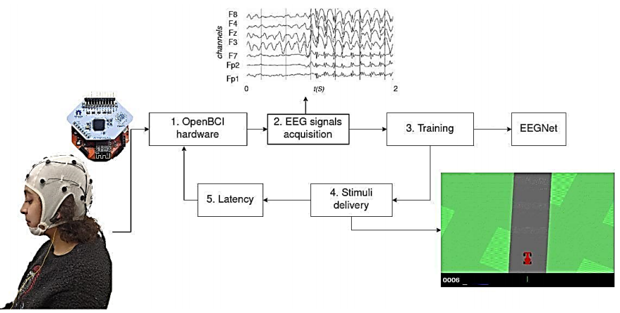 Training and measured latency. An EEGNet model is trained to classify EEG signals in real-time for inputting commands using MI. In the test environment, the subject controls a video game car from Car-Racing (https://www.gymlibrary.dev/environments/box2d/car_racing/). The car constantly moves forward, and the user must steer left or right to stay on the track. The acquisition, preprocessing, and training are all done in real-time.
