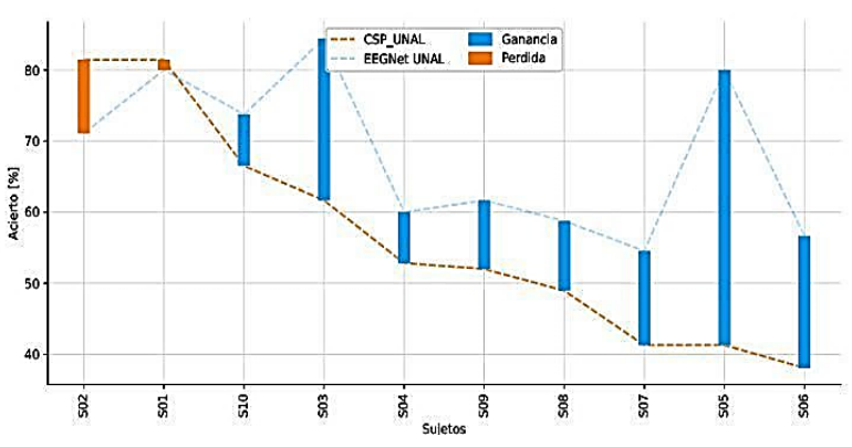 The comparative analysis in Figure 5 between CSP (Cho et al., 2017) and EEGNet (Lawhern et al., 2018) methods for EEG signal classification has indicated a substantial average increase of 21.6% in accuracy for EEGNet, with CSP yielding an accuracy of 56.54% ± 8.78 and EEGNet 68.09% ± 10.73. Nonetheless, the study by Tobón-Henao et al. (2022) suggests a decrease in accuracy for some subjects, which may be attributed to a generalized signal-to-noise ratio reduction approach that does not account for individual signal quality, negatively impacting those with superior EEG signals. This issue results in a tailored application of noise reduction techniques to preserve the integrity of high-quality EEG signals across subjects.