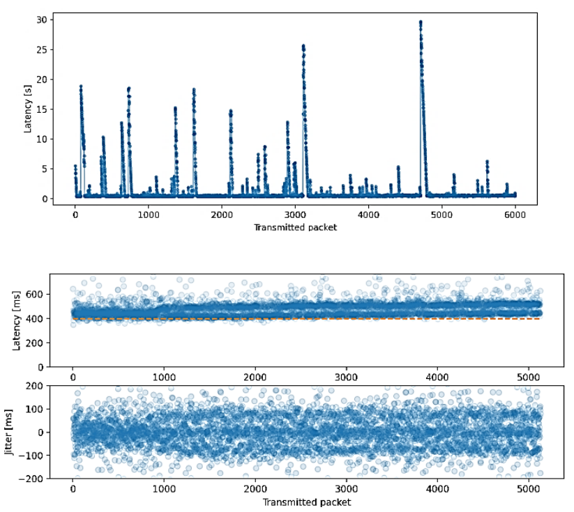 Figure 6 Measurement of latencies and their deviation: (upper) Latency for 6000 consecutive packets, (lower) The standard deviation (jitter) remains within a range of about 150 ms.