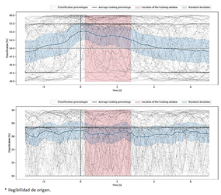 Given that the model requires a time window of 2500 ms, corresponding to the MI window, the system was configured to classify the user’s EEG every 500 ms. Latency is the time between acquiring the last 100 ms packet and the classification. This latency includes everything from deserialization, transmission, and reading carried out by the BCI-Framework to the time it takes for the model to classify the signals successfully.