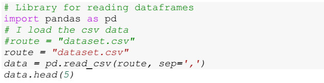 Figure 6 shows the implementation of the artificial neural network, starts with the loading of the data mentioned above. Then, the transformation of categorical and binary variables to numerical variables is performed, an essential step to allow the neural network to process and learn from these variables.