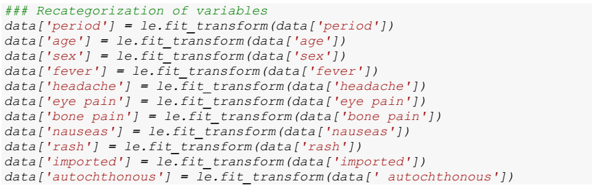The predictor variables and the target variable for the model are defined. The set of predictor variables, denoted as X, is composed of various characteristics, such as 'period', 'age', 'sex', 'fever', 'headache', 'eyes pain', 'bone pain','nausea', 'rash', 'imported' and 'autochthonous'. These features represent the attributes that will be used to make predictions about the model output. On the other hand, the target variable, represented by Y, is associated with the 'outcome' column. This variable contains the class labels that the SVM model will seek to predict during the training and evaluation process.