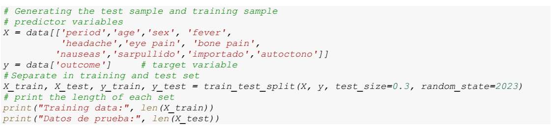 Next, the splitting of the dataset into training and test sets is performed using the train_test_split function. It is important to note that 30% of the dataset is allocated for the test set, while 70% is allocated for the training set. This proportion is determined by the parameter test_size=0.3. In addition, the parameter random_state=2023 is used for the purpose of establishing a random seed and thus ensuring the reproducibility of the experiment in future runs.