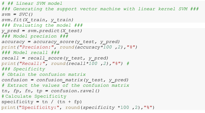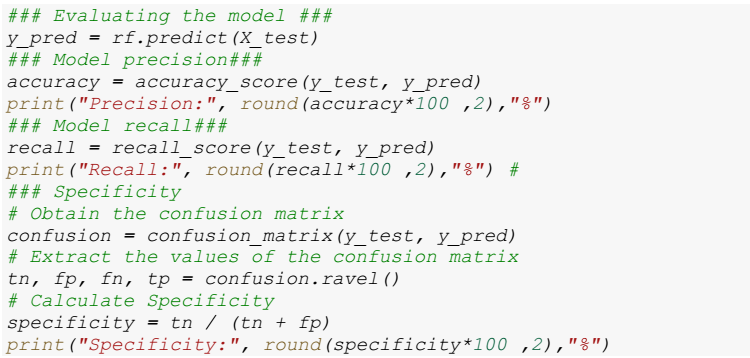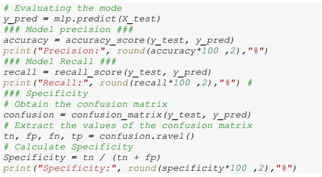 The evaluation of the predictive capability of the model is performed using the test set. Predictions are generated using the predict method, and evaluation metrics such as accuracy, recall and specificity are calculated. The corresponding code is presented below: