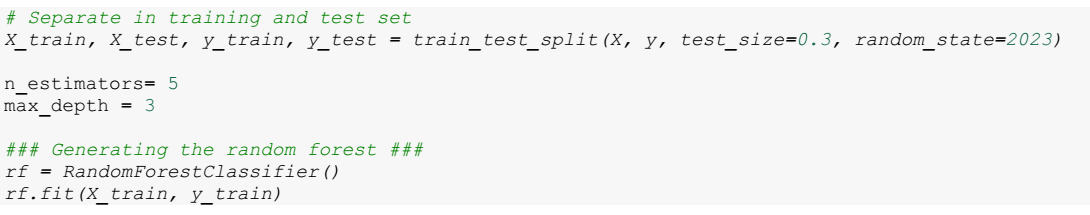 Once the preprocessing is completed, the random forest model is generated using the randomforestclassifier() class. This model is trained with the training set using the rf.fit(X_train, y_train) instruction. This step allows the model to learn patterns and relationships in the training data, preparing it to make predictions about unseen data. Model evaluation is conducted using the test set (X_test), where the random forest model classifies the unobserved data, and the predictions are compared with the actual labels (y_test). Various evaluation metrics, such as precision, recall and specificity, are calculated to provide a detailed understanding of the model performance.