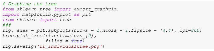 Visualizing an individual tree using tree.plot_tree (Figure 5) provides a detailed understanding of the structure and decisions made by that specific tree within the random forest. The graphical representation is saved in an image file for future analysis and reference. (See Appendix).