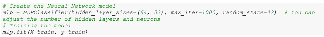 Subsequently, the Multilayer Perceptron (MLP) neural network model is built and trained using the MLPClassifier class from the scikit-learn library.