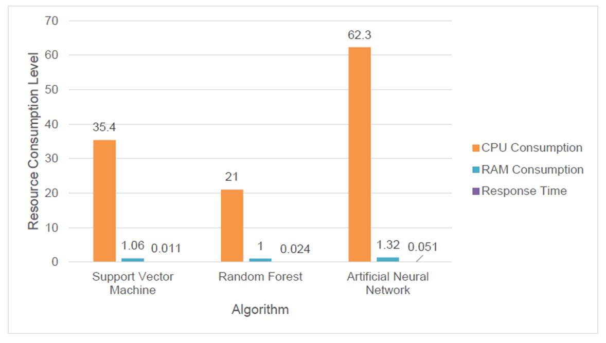 Table 4 presents the computational resources used by each machine learning algorithm during its execution. The support vector machine algorithm used 35.4% of the CPU, consumed 1.06 GB of RAM and exhibited a response time of 0.01 seconds. On the other hand, random forest used 21% of the CPU, consumed 1 GB of RAM and presented a response time of 0.02 seconds. Finally, artificial neural network demanded 62.3% of the CPU, used 1.32 GB of RAM and registered a response time of 0.05 seconds. (Figure 8).