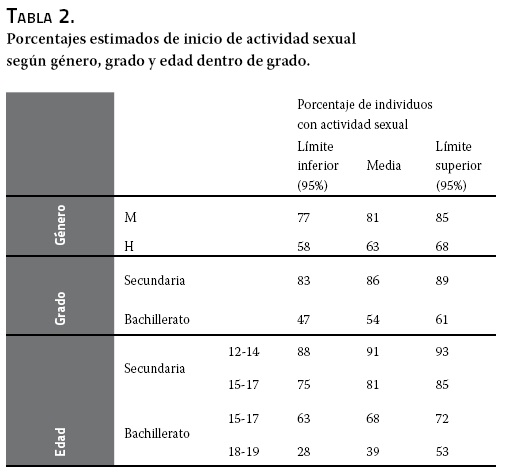 En la tabla 2 se presentan los porcentajes estimados en cada una de las categorías de estas variables, las mujeres presentan un mayor porcentaje de casos sin vida sexual que los hombres, en secundaria hay una mayor porcentaje de casos sin inicio de actividad sexual, mientras que a mayor edad hay un mayor inicio de actividad sexual, tanto en secundaria como en bachillerato; si se compara el bachillerato contra la secundaria solo en la edad común de 15 a 17 años, vemos que en secundaria hay menor porcentaje de individuos que no iniciaron su vida sexual. Esto puede indicar que más allá de la edad, que es un factor para el inicio de la actividad sexual, también hay un efecto del entorno del estudio.