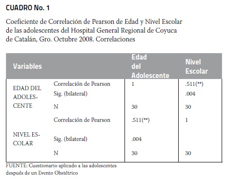 El estudio fue de tipo Cuantitativo, Descriptivo y Transversal, previo consentimiento informado se estudiaron 30 adolescentes con edad entre 15 y 19 años que tuvieron un evento obstétrico durante el tiempo del estudio, La técnica de recolección de datos se efectúo en los meses de septiembre a diciembre del 2008 por medio de un instrumento estructurado con 20 ítems, considerando los aspectos sociodemográficos (edad, estado civil, nivel escolar, ocupación), antecedentes ginecoobstetricos (inicio de vida sexual activa y edad del primer embarazo, aborto, parto o cesárea y número de hijos), tipo de información recibida, (rotafolios, cartel, trípticos, folletos, información verbal y videos). Métodos utilizados de planificación familiar. La validez del contenido se efectuó por medio de 5 expertos del área de salud reproductiva y con amplia experiencia docente, la prueba de confiablidad arrojo un Alfa de Cronbach de 0.820, para el análisis de los resultados se utilizó estadística descriptiva y pruebas no paramétricas de acuerdo a la naturaleza de las variables, a través de Chi cuadrada se probó la significancia de las diferentes proporciones y la correlación de Pearson para conocer el grado de asociación de las variables.11