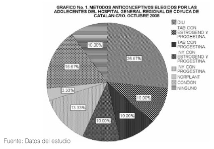 Resultados: El 70% de las adolescentes aceptaron más la información verbal y demostrativa, el 26% selecciono el Dispositivo Intrauterino, el 16.7% prefirió el condón decisión en pareja, el 13 % resolvió utilizar inyectables con progestina, un 10% progestágenos con estrógenos, se encontró una asociación estadística entre la edad y el nivel escolar lo que permitió la aceptación de la información y la elección de los métodos anticonceptivos.