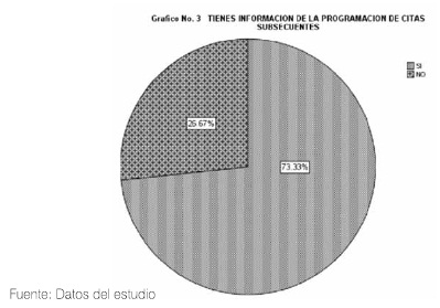En cuanto a la información de la Programación de las citas subsecuentes el 73.3% contestó que la enfermera les informo de la próxima cita, un 26.7% no fueron informadas de las citas subsecuentes, entre las adolescentes no citadas se encuentran las que no desearon métodos anticonceptivos y la otra proporción corresponde a las adolescentes que aceptaron Dispositivo intrauterino y el Parche Norplant, es primordial la información de estos dos últimos métodos, por que presentan algunas alteraciones sobre todo el Parche Nortplant puede ocasionar hematoma en el sitio de aplicación e infección local. (Grafica No.3)