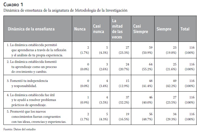 El 70.7% (82), estableció una dinámica tal que el alumno aprendiera a través de la reflexión y de su propia experiencia, lo que le permitió al 76.8% (89) fomentar su aprendizaje como un proceso de crecimiento y de cambio, así como fomentar su independencia y responsabilidad en un 83.6% (97) y le permitió al 78% (90) de los alumnos que sus nuevos conocimientos fueran congruentes con sus ideas, creencias y experiencias (cuadro 1)