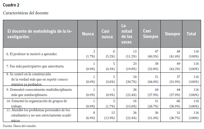 De los alumnos entrevistados 95 (81.9%) refirió que el docente lo motivo a aprender y 87 (75%) alumnos exteriorizaron que el docente tiene una actitud más participativa que autoritaria; 88 (75.9%) declararon que el docente se centró en la construcción de la verdad más que en repetir los conocimientos ya probados y así mismo expresaron que el docente tiene un conocimiento multidisciplinario; 97 (83.6%) de los alumnos dijeron que el docente fomentó la organización de grupos de trabajo y 67 (57.7%) alumnos informaron que otra característica de los docentes es que atendieron problemas personales de los estudiantes y no sólo estrictamente académicos (cuadro 2).