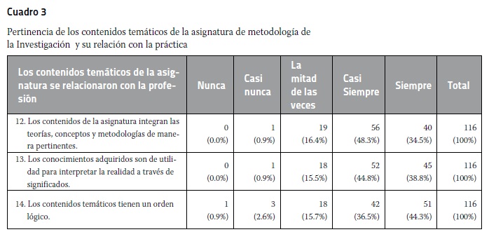 96 alumnos (82.9%) consideran que la asignatura integra teorías, conceptos y metodologías de forma pertinente, 97 (83.6%) refieren que los conocimientos son de utilidad para interpretar la realidad y el 93 (80.8%) manifiestan que tienen un orden lógico (cuadro 3).