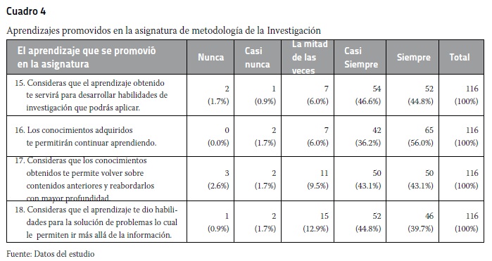 De los alumnos encuestados 106 (82.8%) consideraron que el aprendizaje obtenido le permitirá desarrollar habilidades de investigación, 107 (92.2%) manifestaron que los conocimientos adquiridos le permitirán continuar aprendiendo, 100 (86.2%) consideran que de los conocimientos obtenidos le permitirán volver sobre contenidos anteriores y retomarlos con mayor profundidad, 98 (84.5%) de los entrevistados declararon que el aprendizaje obtenido le dio habilidades para solucionar problemas y lo que le permitirá ir más allá de la información (cuadro 4).