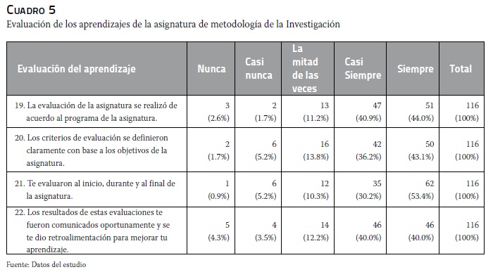 Del total de alumnos encuestados 98 (84.9%) respondieron que la evaluación de la asignatura se realizó de acuerdo al programa de la asignatura de metodología de la investigación, así mismo 92 (79.3%) alumnos dijeron que los criterios de evaluación se definieron claramente con base a los objetivos de la asignatura, 97 (83.6%) fueron evaluados al inicio, durante y al final de la asignatura y 92 (80%) reportaron que los resultados de las e valuaciones les fueron comunicados oportunamente y se dio una retroalimentación para mejorar su aprendizaje (cuadro 5).