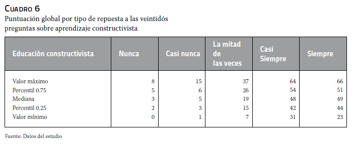 Results: During the first week of December, 2008, 116 surveys were applied, the analysis of them showed that the percentile distribution of the indicator of overall score for constructivist learning accumulate higher frequencies for responses of "almost always"percentile 0.25 (42), medium (48) and percentile 0.75 (54), for the answer "always"percentile 0.25 (44), medium (49) and percentile 0.75 (51).