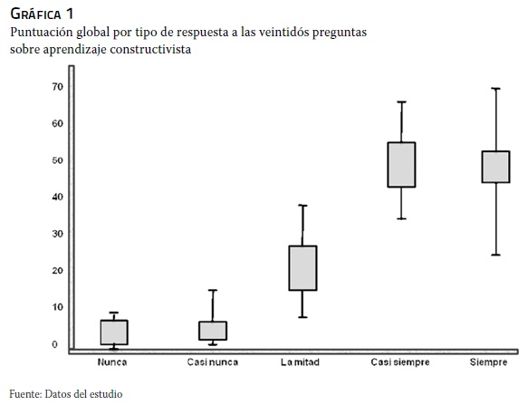 Resultados: Durante la primera semana de diciembre de 2008, se aplicaron 116 encuestas; el análisis de ellas, mostró que la distribución percentilar del indicador de puntuación general para el aprendizaje constructivista acumulo las frecuencias más altas para las respuestas de "casi siempre" percentil 0.25 (42), mediana (48) y percentil 0.75 (54); para la respuesta "siempre" percentil 0.25 (44), mediana (49) y percentil 0.75 (51).