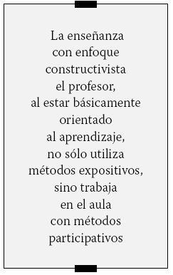 La enseñanza con enfoque constructivista el profesor, al estar básicamente orientado al aprendizaje, no sólo utiliza métodos expositivos, sino trabaja en el aula con métodos participativos que motiven en los estudiantes la capacidad de pensar por sí mismos. Plantea un problema y le da seguimiento a la exploración de los estudiantes, sienta una guía para la indagación y promueve nuevos caminos de pensamiento. El profesor hace del aula un espacio neutro para que los estudiantes intercambien sus puntos de vista personales y los argumenten a la luz de las ideas de los demás, de modo que cada uno pueda continuar construyendo su conocimiento.8
