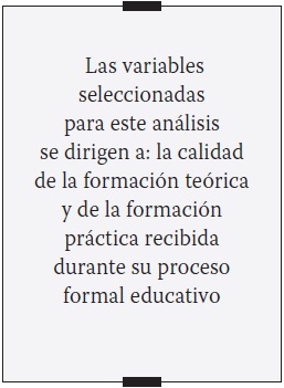 Las variables seleccionadas para este análisis se dirigen a: la calidad de la formación teórica y de la formación práctica recibida durante su proceso formal educativo, a la congruencia experimentada entre la formación recibida y la práctica desempeñada en el ámbito profesional, valoradas con escalas tipo Likert que clasifican desde un máximo hasta un valor nulo.