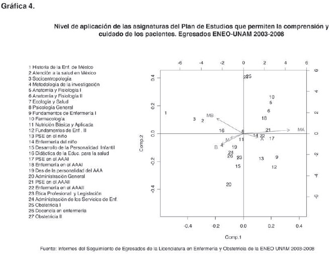 Resultados: La calidad de la formación teórica fue considerada superior a la calidad de la formación práctica. La congruencia entre la formación recibida y la práctica desempeñada fue evaluada prioritariamente como regular. Las actividades con mejor preparación fueron: cuidados complejos y cuidados sencillos para la resolución de problemas, cuidados para la resolución de necesidades fisiológicas y apoyo integral. El principal eje biplot, en lo cuadrantes valorados como alto y muy alto por su aplicación para la comprensión y cuidado del paciente, conjunta a las asignaturas: Proceso salud Enfermedad del Adolescente, Adulto y Anciano (AAA) I y II, Enfermería del AAA II y Enfermería del Niño. Ambos cuadrantes muestran además materias básicas. En el cuadrante de baja aplicación están las metodológicas, administrativas, y de apoyo psicológico y biológico. Las de muy baja aplicación pertenecen al área de las humanidades. La confiabilidad del biplot es de 96.5%.