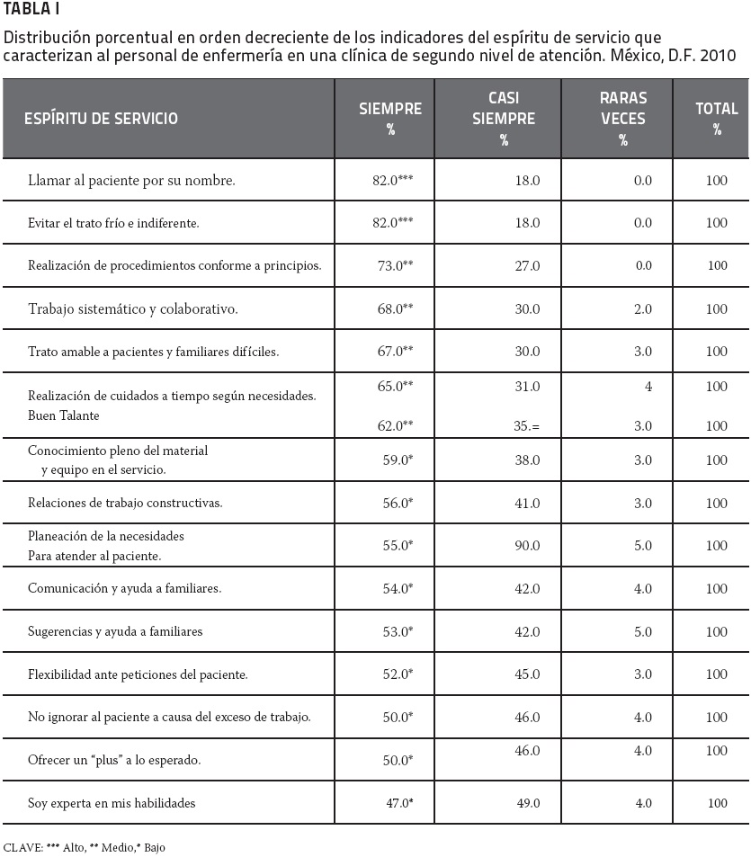 Los indicadores del espíritu de servicio que caracterizan al personal de enfermería entrevistado se expresan de manera diferenciada. Uno de los atributos mejor calificados es definitivamente el que se dirigen al paciente por su nombre evitando el trato frío o indiferente aunque lo deseable es que estos dos atributos vayan "siempre" acompañados de un buen talante al realizar los procedimientos. los indicadores relacionados con la realización de los procedimientos conforme a principios científicos y éticos en un ambiente de trabajo organizado, sistemático y colaborativo son indicadores que pueden superar los valores actuales y mantenerse en el "siempre". Será conveniente en posteriores estudios establecer la correlación entre la organización para el trabajo y la realización de procedimientos conforme a procedimientos científicos y éticos. Este es un rubro que conjunta la política del servicio de enfermería y la voluntad individual de actuar científica y éticamente.